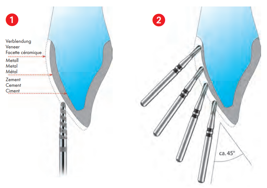 Reduce the crown metal layer gradually, which means starting the procedure from top to bottom end several times. opt. speed 120,000 - 160,000 r.p.m.,Contact pressure: 0.5 N, Please observe the working angle of 45 degrees!